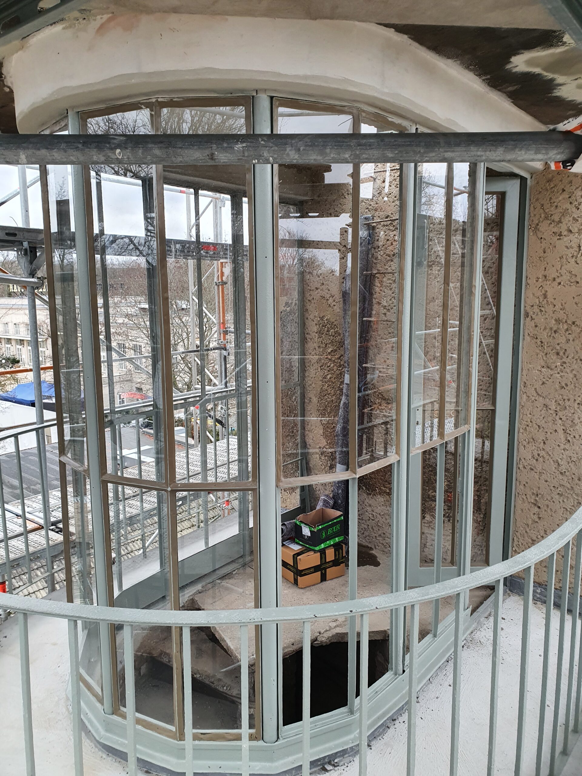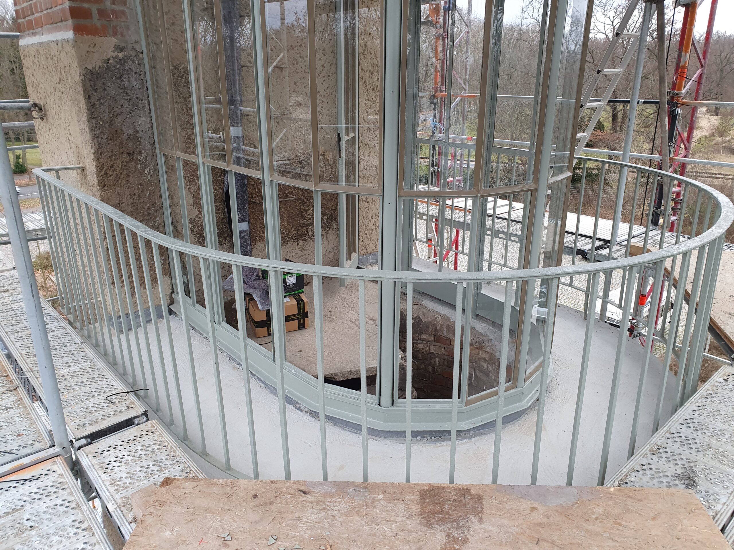 Das Ergebnis ist eine vollständig wiederhergestellte Turmkanzel, die ihre historische Eleganz zurückgewonnen hat. Der größte Erfolg des Projekts: Trotz des schlechten Ausgangszustands konnten rund 90 % der originalen Stahlkonstruktion erhalten und weitergenutzt werden. Die gelungene denkmalgerechte Sanierung wurde als so vorbildlich eingestuft, dass der Bauherr eine Förderung von der Deutschen Stiftung Denkmsschutz erhielt. Das ist eine wunderbare Anerkennung für die sorgfältige und substanzschonende Arbeit.