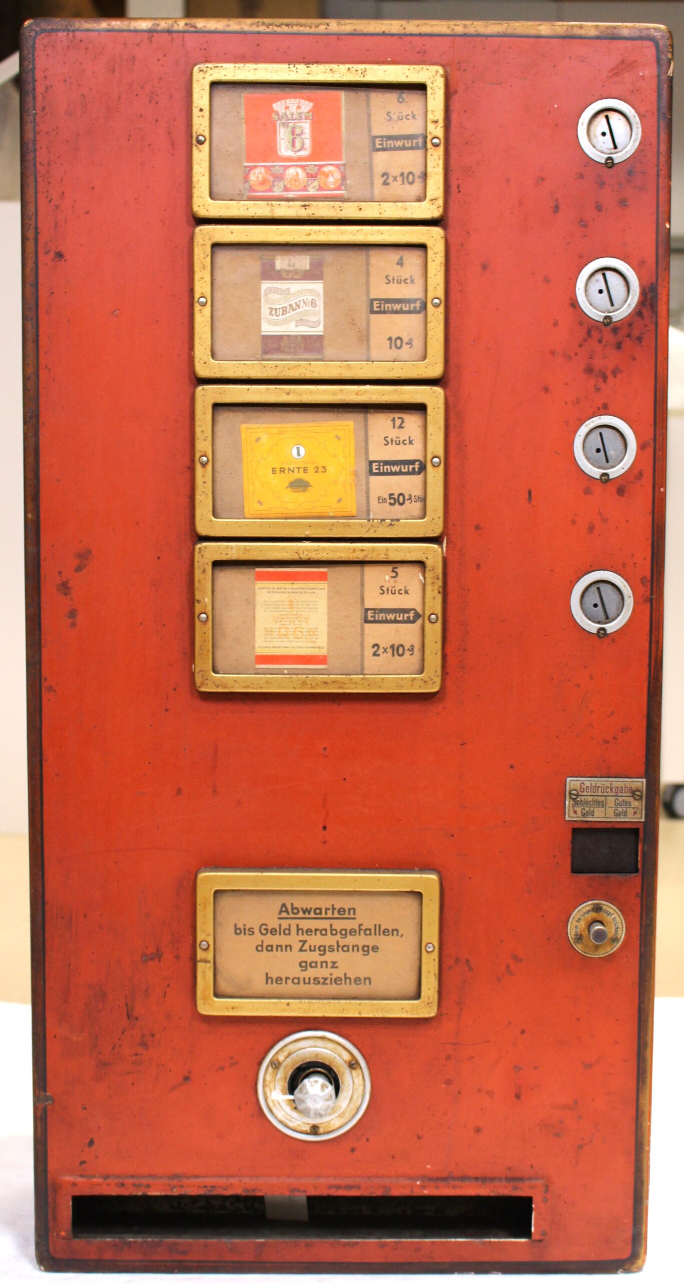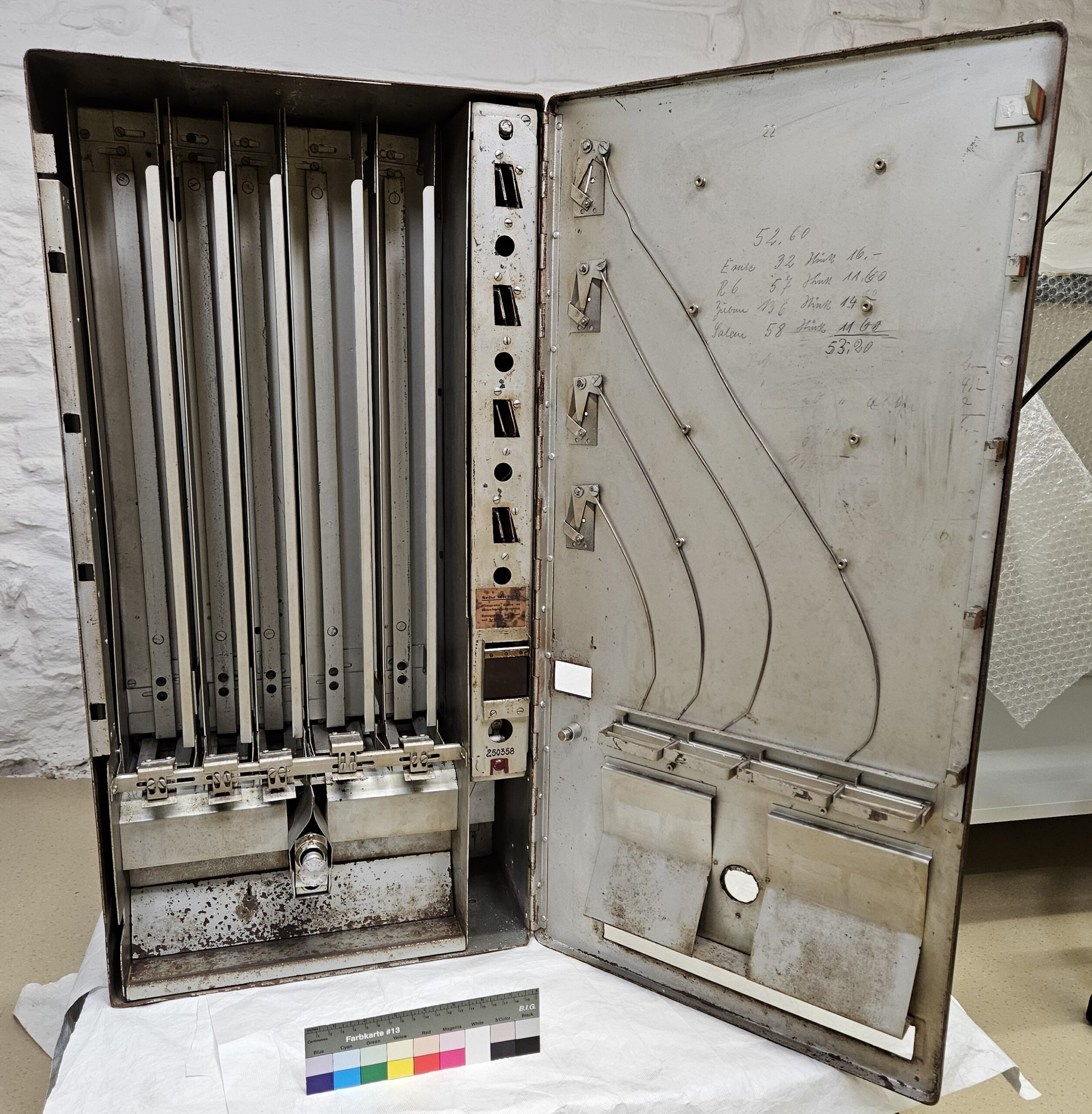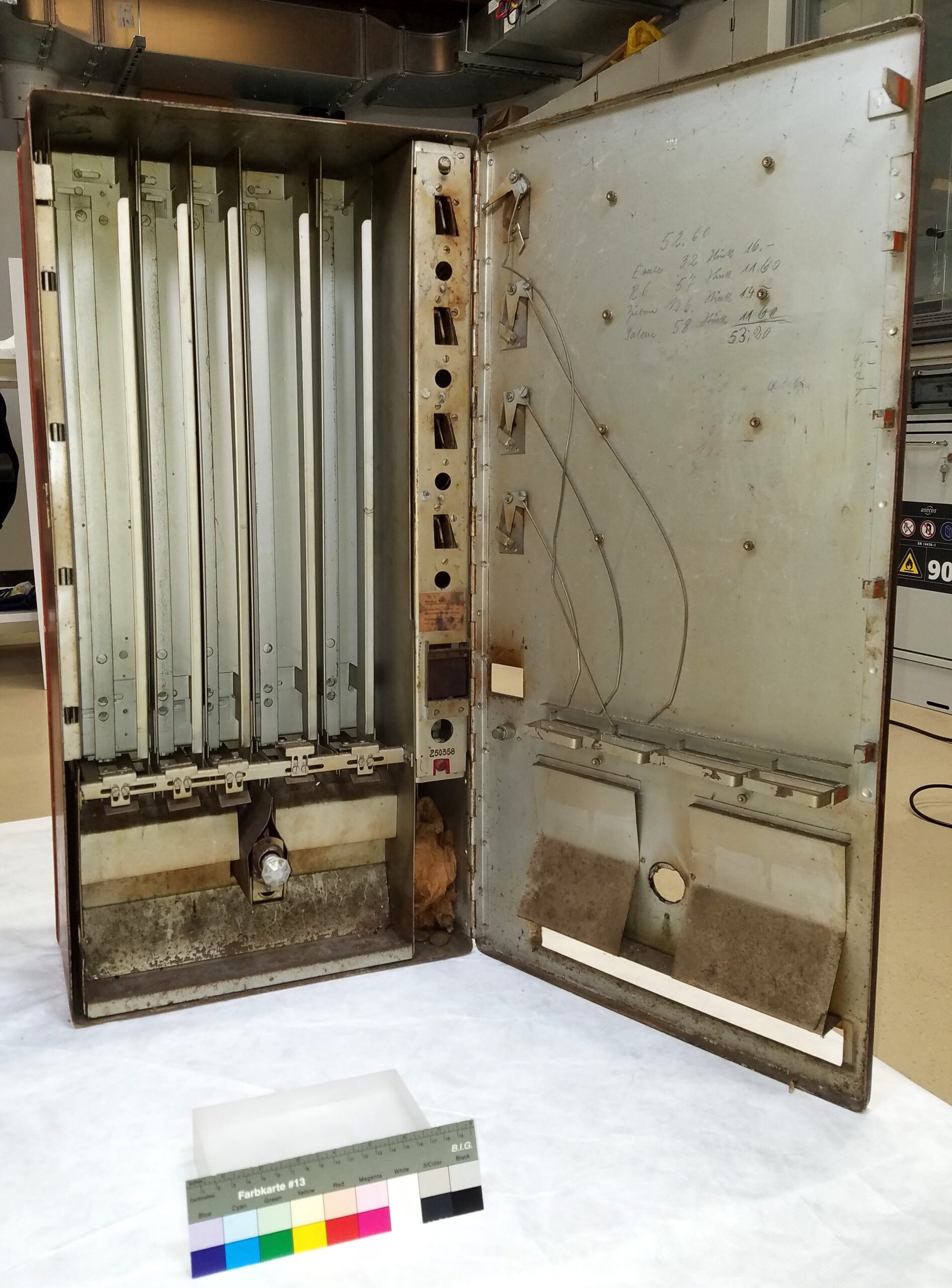 Für das Haus der Bayerischen Geschichte in Regensburg stand die Aufarbeitung eines historischen Zigarettenautomaten an. Das Objekt zeigte deutliche Spuren seiner früheren Nutzung im Freien und anschließender Vernachlässigung. Beispielsweise war der rote Lack stumpf und partiell korrodiert, sowohl innen als auch außen. Deshalb war eine sorgfältige konservatorische Reinigung des Museumsobjekts notwendig. Ziel war es, seinen Zustand zu stabilisieren und die Lesbarkeit für die museale Präsentation zu verbessern.