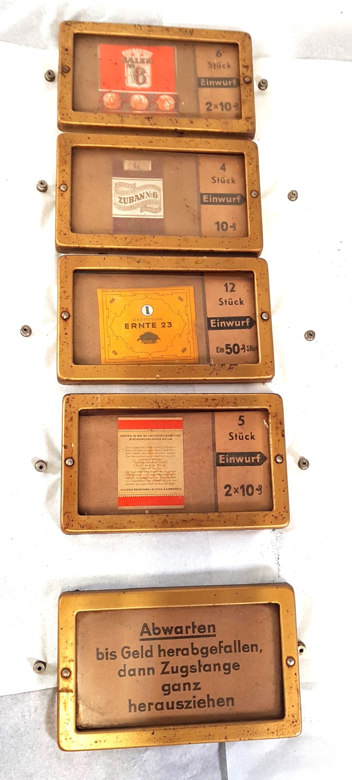 Während der Demontage und Reinigung kamen im Inneren des Automaten interessante Fundstücke zum Vorschein: alte Münzen und sogar Reste eines alten Reinigungsmittels. Diese Funde sind Zeugen der langen Nutzungsgeschichte. Sie wurden dokumentiert und dem Museum übergeben. Die Reinigung selbst erforderte Geduld und Fingerspitzengefühl. Denn die originalen Oberflächen sollten nicht beschädigt werden. Dennoch mussten die störenden Korrosionsprodukte und Schmutzschichten reduziert werden.