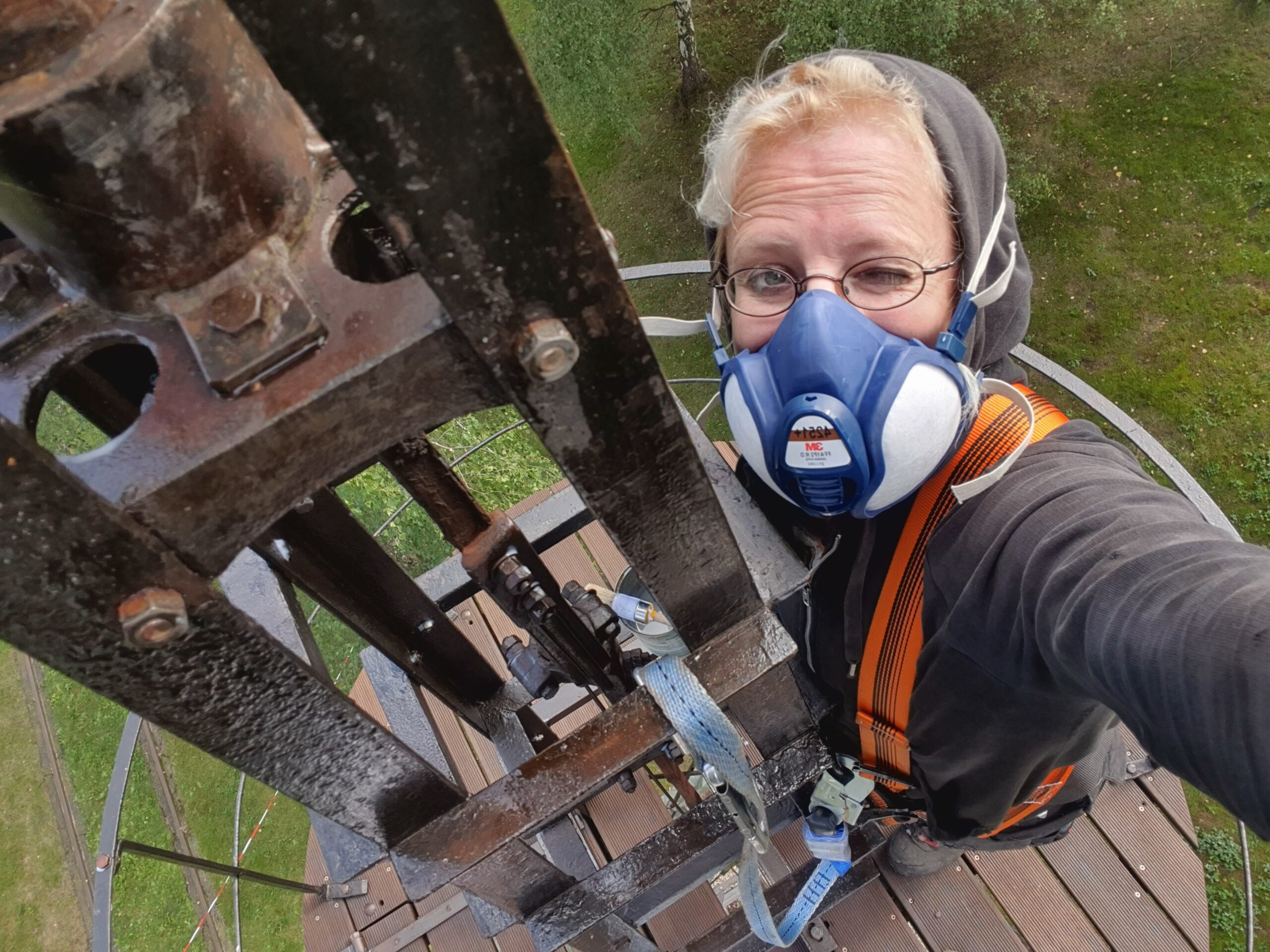 Der Auftrag umfasste die Entfernung der aktiven Korrosion, die Erneuerung des transparenten Lacks im unteren Bereich und das Auftragen eines schützenden Wachses. Aufgrund des begrenzten Zugangs mussten jedoch alle Arbeiten entweder von einem Hubsteiger aus oder direkt auf der Plattform, gesichert im Klettergeschirr, durchgeführt werden. Eine weitere Anforderung war außerdem die Anfertigung einer abschließbaren Leitersicherung, um das Denkmal vor unbefugtem Beklettern zu schützen.