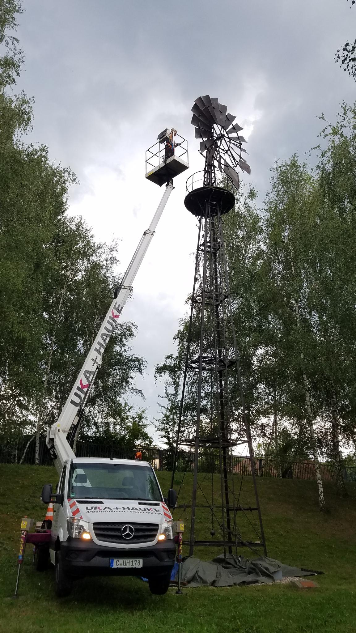 Nach der Erstellung von Probeflächen wurden zuerst die punktuellen Korrosionsstellen sorgfältig entfernt und der transparente Decklack erneuert. Als finale Schutzmaßnahme wurde die gesamte Oberfläche anschließend mit einem speziellen Wachs überzogen. Dieser optimierte Korrosionsschutz am Denkmal verlängert die Standzeit der Lackierung erheblich. Abschließend wurden alle beweglichen Teile neu abgeschmiert, um so die Funktion des Windrades zu gewährleisten.